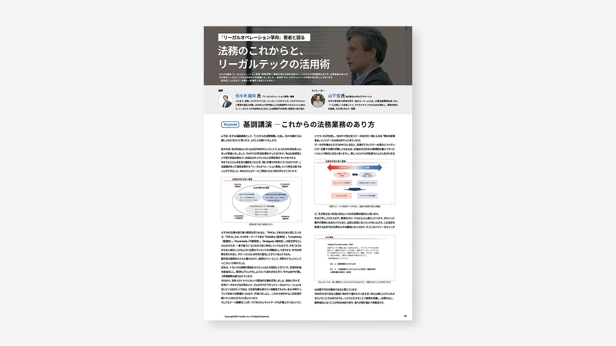 本稿は、2021年1月21日に行われた社内向け勉強会にて、 Hubbleをご導入いただいている太陽誘電株式会社法務部長(当時)の佐々木氏に、法務業務の効率化についてご講演いただいた内容を紹介するものです。