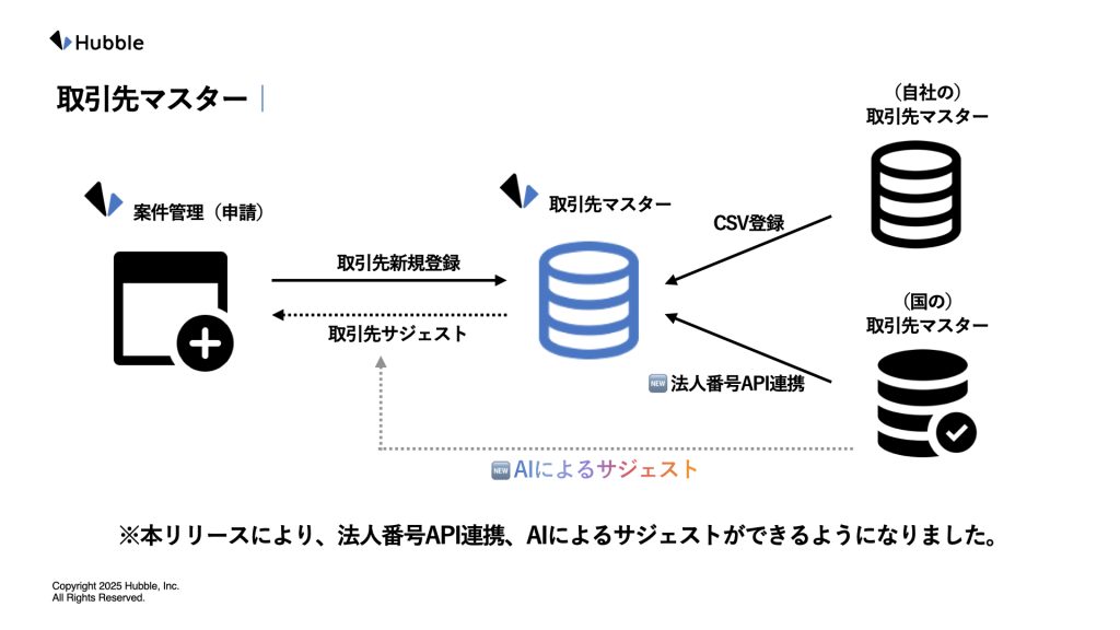 契約のある取引先情報を一元的に管理できる「取引先マスター機能」で、法人番号APIと連携し、取引先マスターの新規登録、更新ができるようになりました。