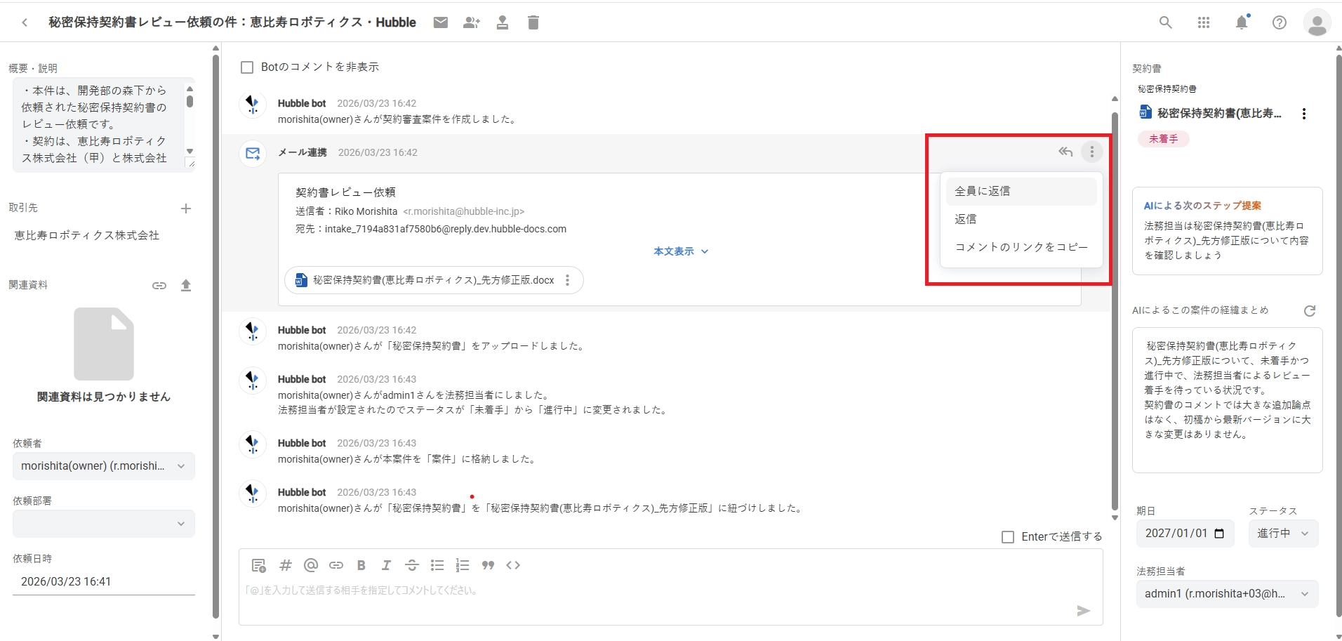 案件管理機能で、案件詳細に連携されたメールに対して、そのまま返信メール(「返信」「全員に返信」)を作成・送信できるようになりました。送受信したメールは自動で案件に紐づくため、案件単位でメールの往復履歴をひと目で追えるようになります。