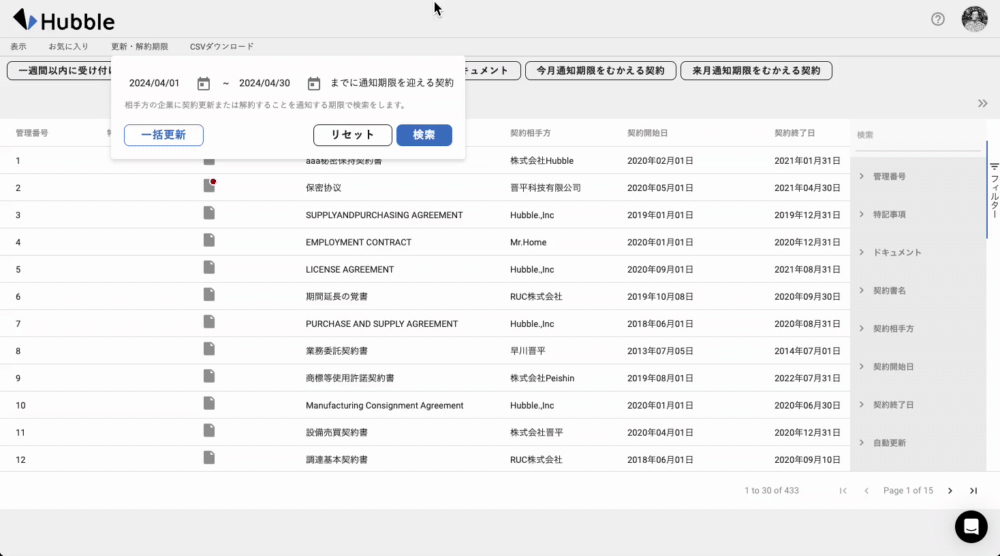 契約終了日の一括更新機能により、自動更新を反映した終了日の一括更新がされるようになったので、自動更新条項の有無を確認しなくても、契約管理台帳の項目で正確に契約期間を把握できるようになりました。