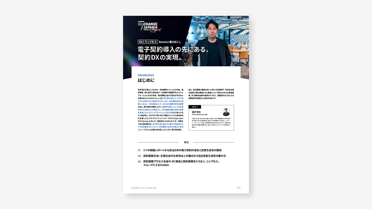 本資料は、2023年 3月14日に弁護士ドットコム株式会社が主催したビジネスカンファレンス「 Re:Change Japan 2023 Spring 」において、株式会社 HubbleのCLO/弁護士である酒井智也が、電子契約導入済みの企業が今後見据えるべき契約業務 DX について、契約業務の全体の効率化に焦点を当てて解説した内容を書き起こしています。