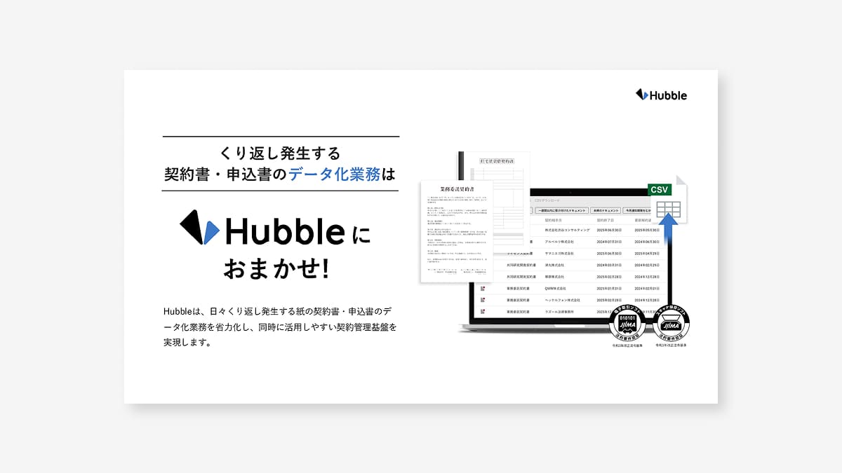 Hubbleは、日々くり返し発生する紙の契約書・申込書のデータ化業務を省力化し、同時に活用しやすい契約管理基盤を実現します。本資料は、Hubbleのデータ化支援についてわかりやすくまとめたサービス紹介資料です。