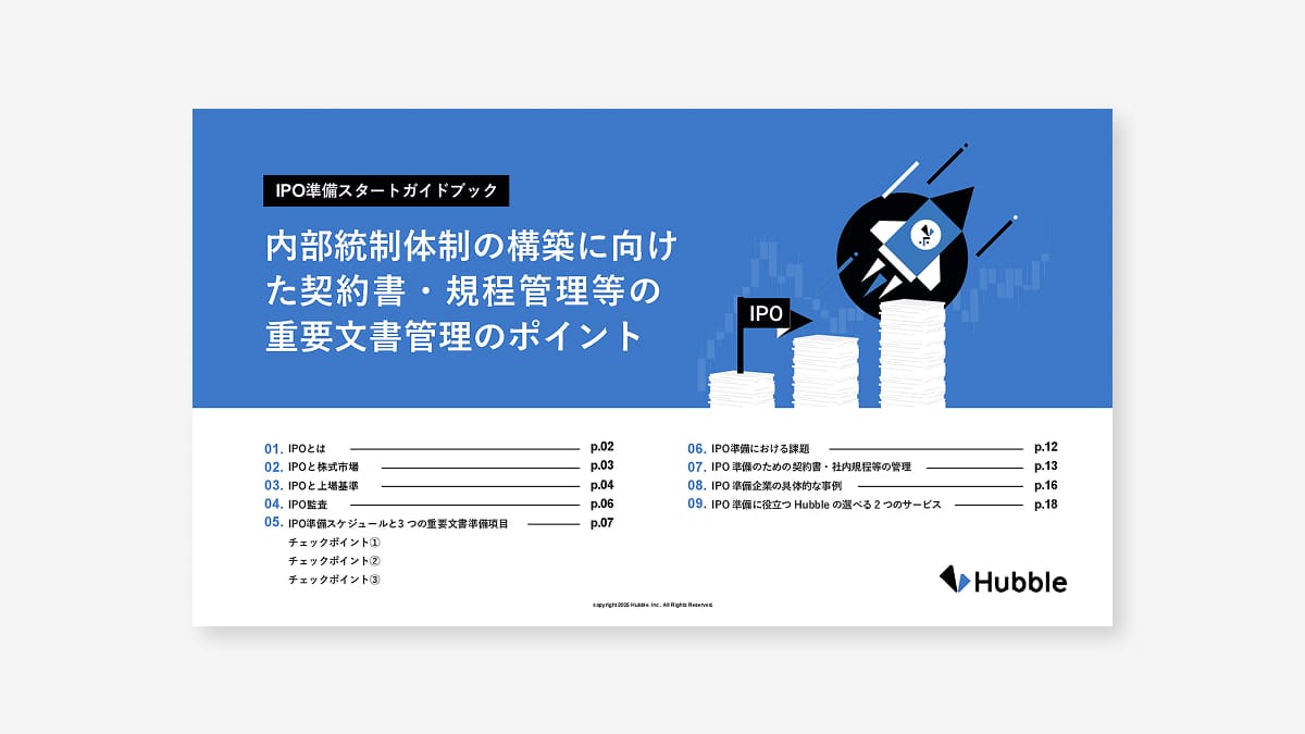 本資料では、IPOの意義、グロース市場やプライム市場における上場基準の違い、IPOまでのスケジュールと、「N-3」期から始めておくべきチェックポイントをはじめ、資金調達実務では意識しきれない、IPO監査で求められる内部統制体制の構築に向けた契約書・規約管理等の重要文書の管理について解説しています。