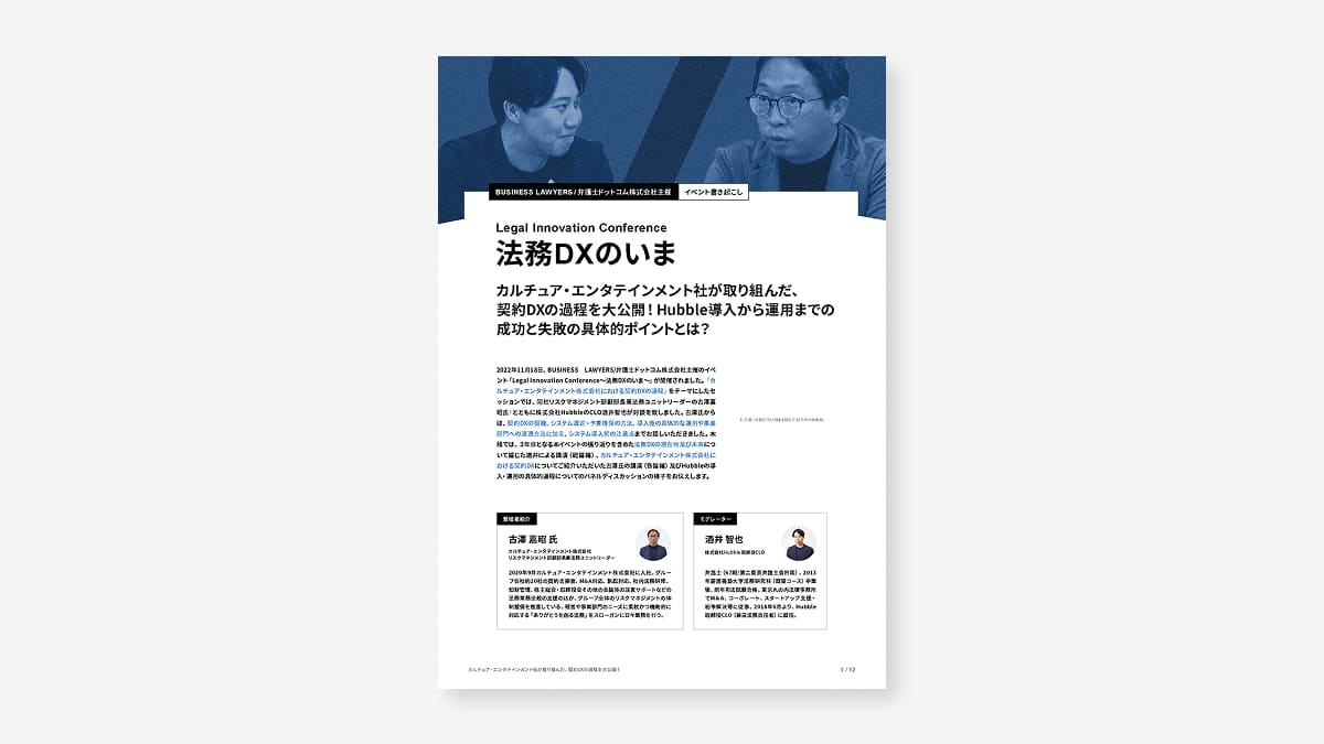 法務DX」、「契約DX」という言葉をよく耳にするようになりました。しかし、「DX」という言葉は抽象的で、何を目指しているのかどのような効果があるのか、また、何をすればDXを実現できるのか、共通認識が形成されている状況とは言えません。そこで、本資料は、「カルチュア・エンタテインメント社の契約契約DX」を実例に、「契約DX」の具体的内容を提示しています。
