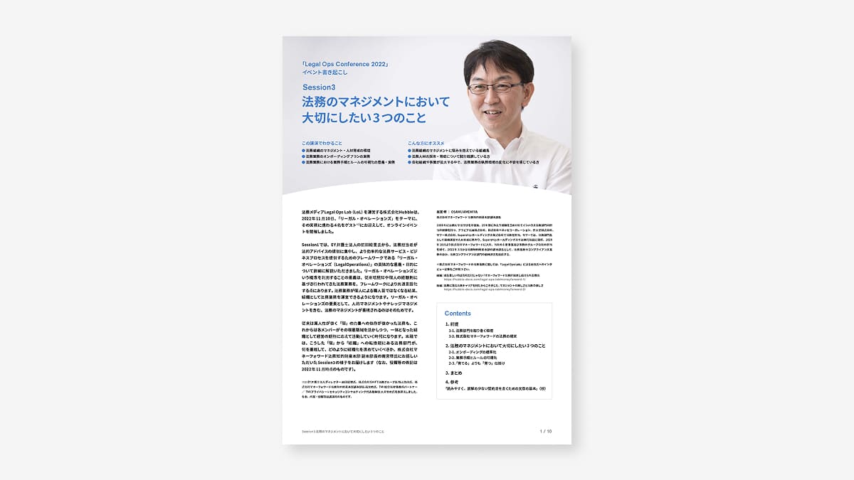 本資料は、Session3「法務のマネジメントにおいて大切にしたい3つのこと」と題して株式会社マネーフォワード 法務知的財産本部 副本部長※ 雨宮 修氏にご講演いただいた内容を書き起こしたものです。