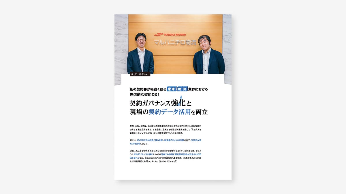 全国に点在する物流拠点毎に異なる契約書管理体制をとっていた同社では、どのように契約ガバナンスを強化しながら現場でも自然に契約関連情報が活用される環境を整えたのか。株式会社マルハニチロ物流総務人事部課長 深海琢也氏及び同部主任 田村潤氏にお伺いしました。