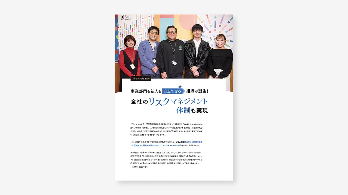 「earth music&ecology」、「Green Parks」、「AMERICAN HOLIC」等、10以上のアパレルブランドを全国に展開している株式会社ストライプインターナショナルは、どのように拠点間や部署間での契約業務の連携と会社全体のリスクマネジメント体制の強化を同時に実現したのか。