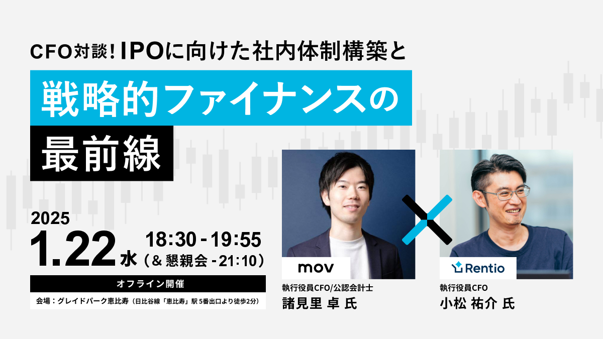 本イベントでは、2024年には累計で40億円超のデットファイナンスを実現したレンティオ株式会社 執行役員CFO 小松祐介氏と、2024年にはシリーズBにて、日本初の通信キャリア系CVC4社からの同時出資など含め、累計調達額が37億円を突破した株式会社mov 執行役員 CFO/公認会計士 諸見里 卓 氏の2名のCFOをお招きし、各企業のファイナンス戦略やIPOに対する考え方、CFOとしてのバリューの出し方など、ここでしか聞けないCFO同士の豪華対談をお届けします。